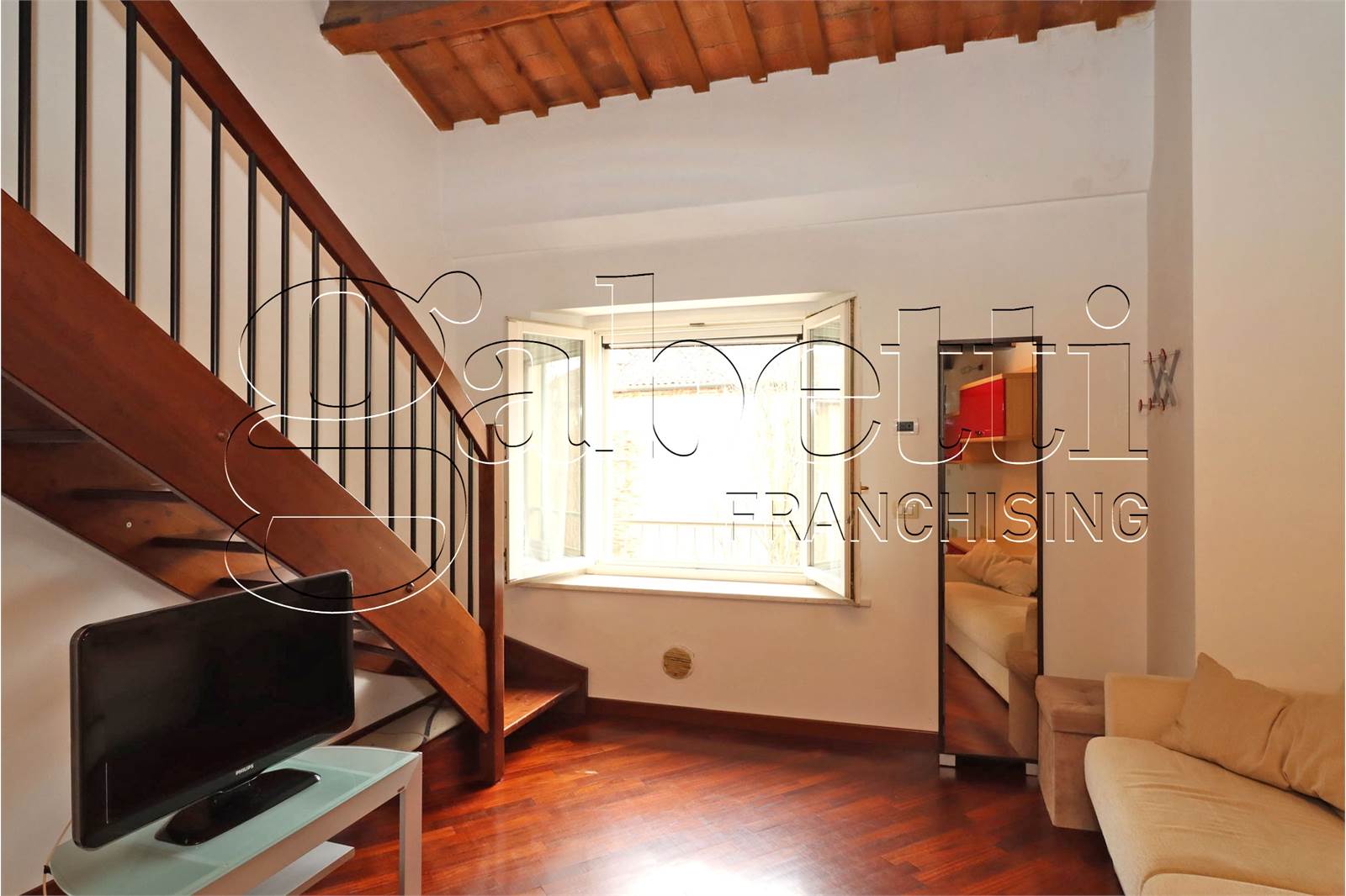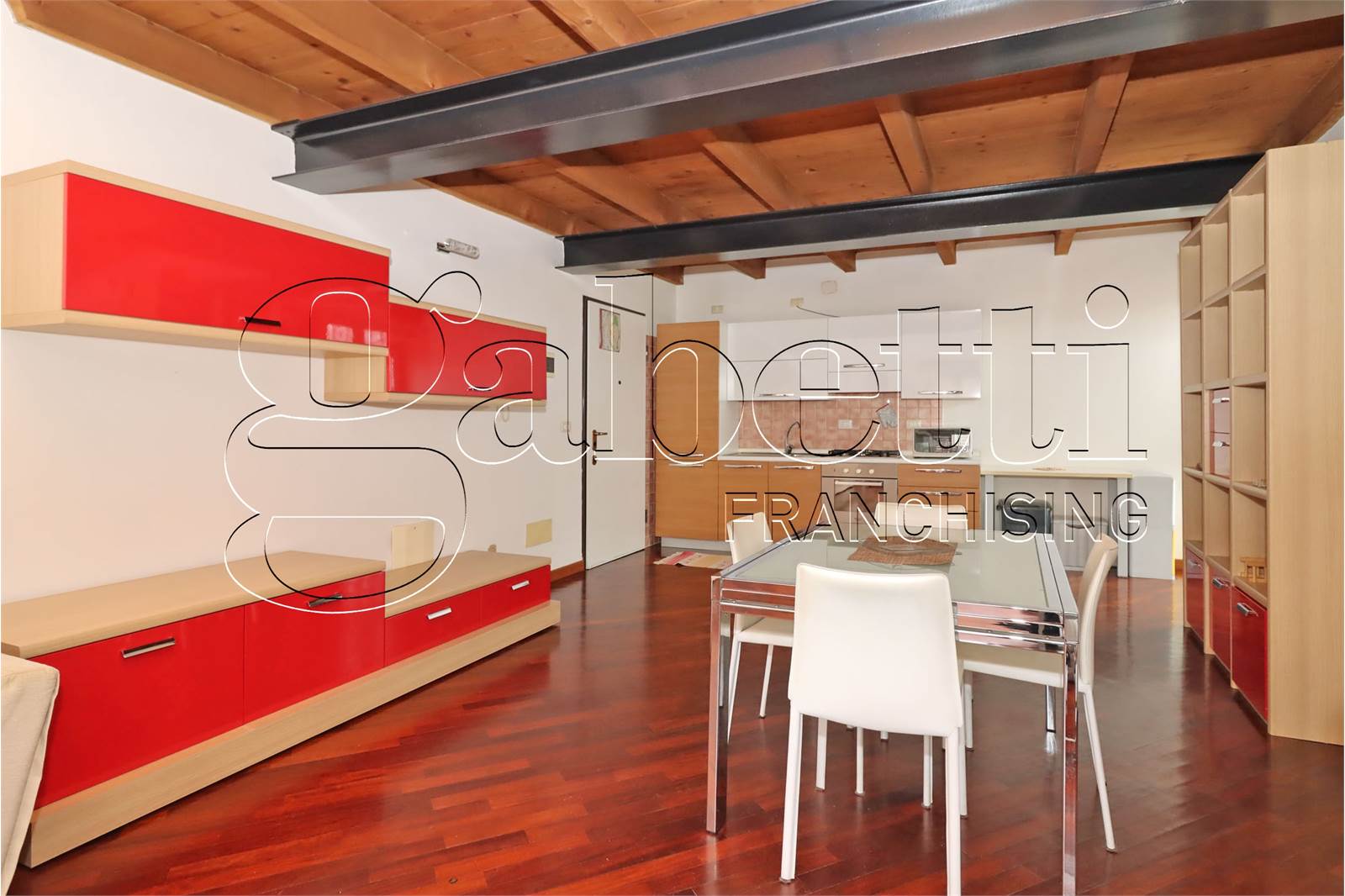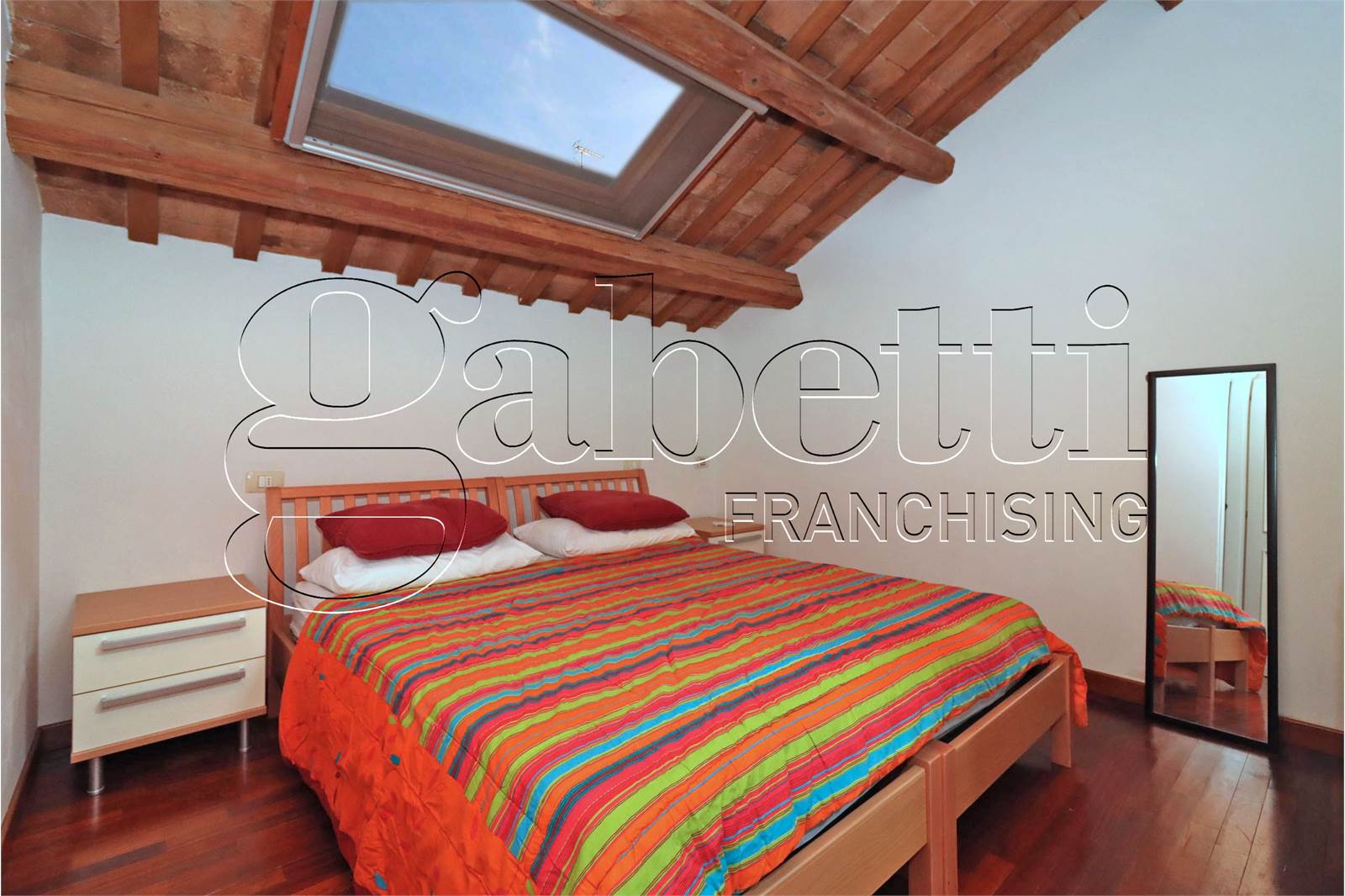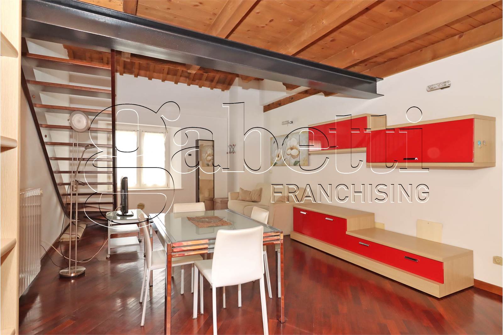 L'abitazione si dispone su due livelli ed è composta da un ampio e luminoso salone con angolo cottura al primo livello, scala a vista in legno per accesso al piano superiore con camera matrimoniale dotata di velux, cabina armadio e bagno finestrato.